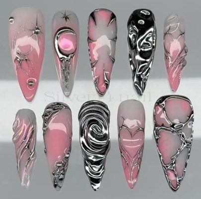 Sự kết hợp giữa nền hồng nude và hiệu ứng chrome nổi tạo cảm giác mạnh mẽ, hiện đại. Các khối kim loại uốn lượn mang hơi hướng Y2K rõ nét, cá tính và độc đáo. Bộ nail dành cho cô nàng thích sự khác biệt và phong cách thời trang nổi bật.