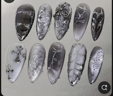 Nail tông tím khói – đen kết hợp hiệu ứng loang và charm kim loại mang cảm giác bí ẩn, sắc sảo. Thiết kế đậm chất nghệ thuật, cá tính và thời trang. Phù hợp với những cô nàng theo đuổi phong cách Y2K cool girl, mạnh mẽ và khác biệt.