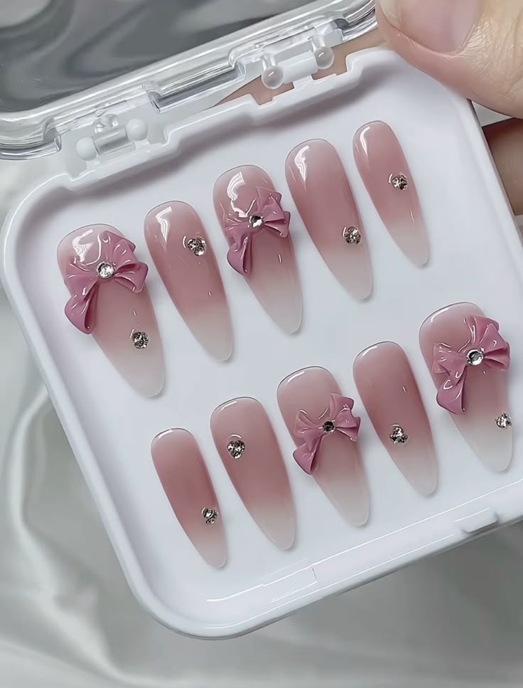 Thiết kế ombre hồng sữa nhẹ nhàng, điểm nơ nổi và đá nhỏ tinh tế. Tổng thể mang cảm giác ngọt ngào, nữ tính nhưng không quá cầu kỳ. Bộ nail phù hợp cho những nàng yêu phong cách tiểu thư, đi hẹn hò, dự tiệc nhẹ hoặc chụp ảnh concept dịu dàng.