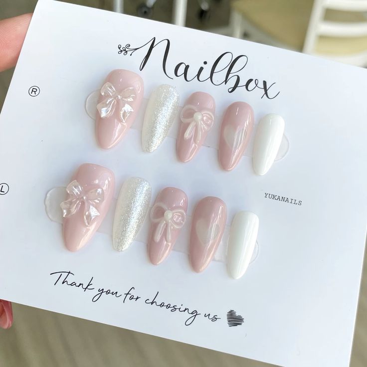 Sự kết hợp giữa hồng nude, trắng sữa và nhũ nhẹ mang lại vẻ thanh lịch, tinh khôi. Điểm nhấn nơ trong suốt giúp bộ nail trở nên mềm mại và sang hơn. Phù hợp cho cô dâu, chụp ảnh concept tiểu thư hoặc những ai yêu phong cách nhẹ nhàng, tinh tế.