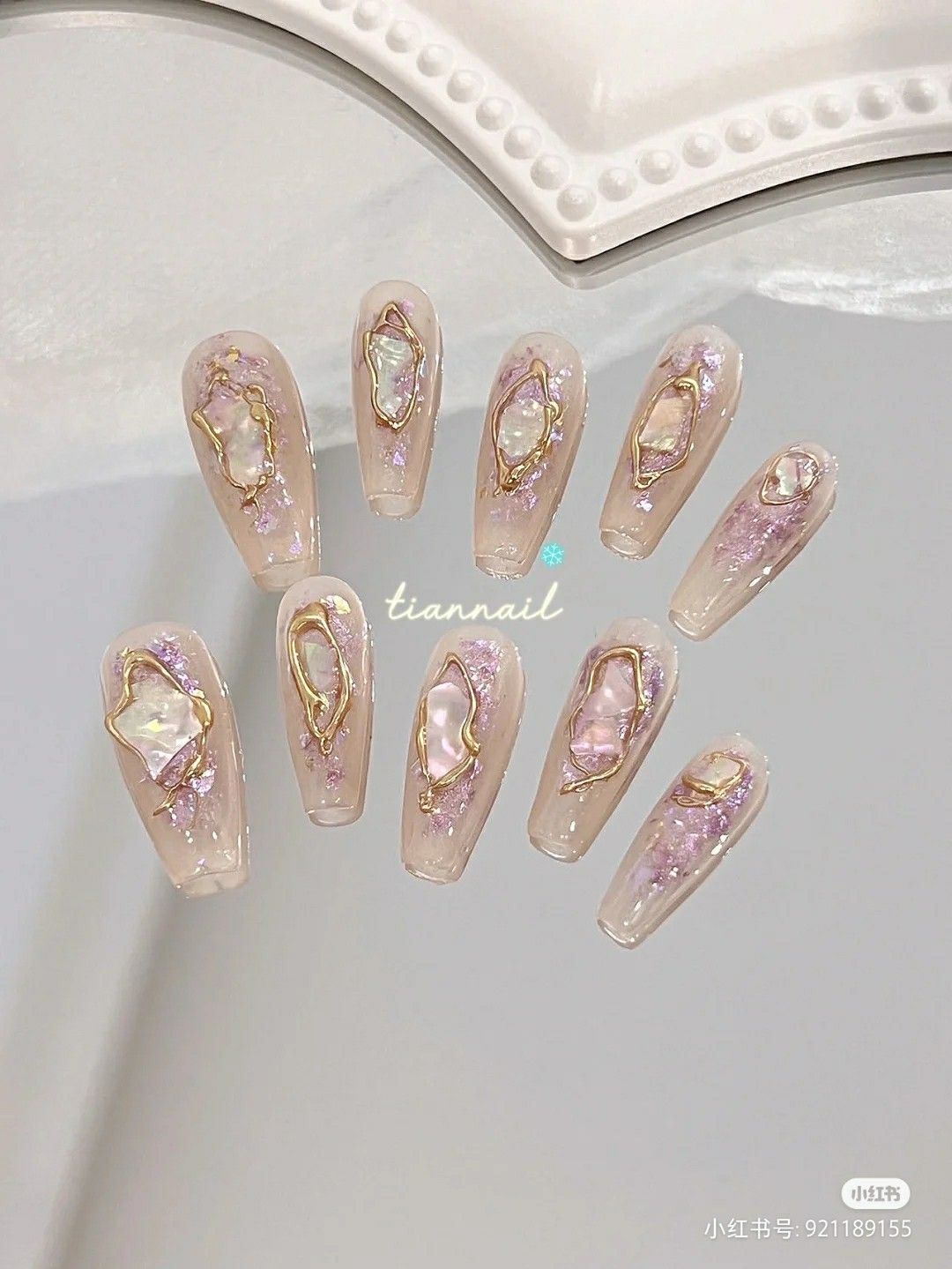 Bộ nail sử dụng nền nude hồng cam trong kết hợp đá pha lê và viền kim loại ánh vàng sang trọng. Hiệu ứng lấp lánh nhẹ tạo chiều sâu cho móng, mang lại cảm giác cao cấp và thanh lịch. Rất hợp với cô nàng yêu vẻ đẹp tinh xảo, sang nhưng không quá phô trương.