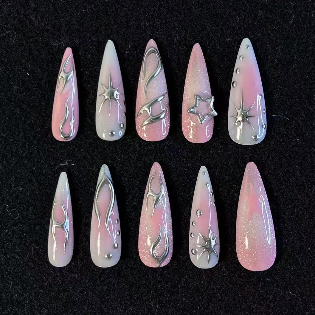 Nail form nhọn với nền hồng ánh nhũ và chi tiết kim loại uốn lượn độc đáo. Thiết kế mang cảm giác vũ trụ, mạnh mẽ nhưng vẫn có độ nữ tính. Phù hợp với phong cách Y2K, đi tiệc tối, chụp ảnh concept cá tính hoặc outfit phá cách.
